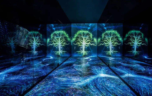 沉浸式光影互動投影是基于多通道視覺同步技術和立體顯示技術的視覺協(xié)同環(huán)境。系統(tǒng)提供房間大小的四面(或六面)立方體投影顯示空間,所有參與者完全沉浸在由立體投影圖像包圍的環(huán)境中,并且將揚聲器系統(tǒng)和運動采集系統(tǒng)結合以獲得沉浸式交互體驗。